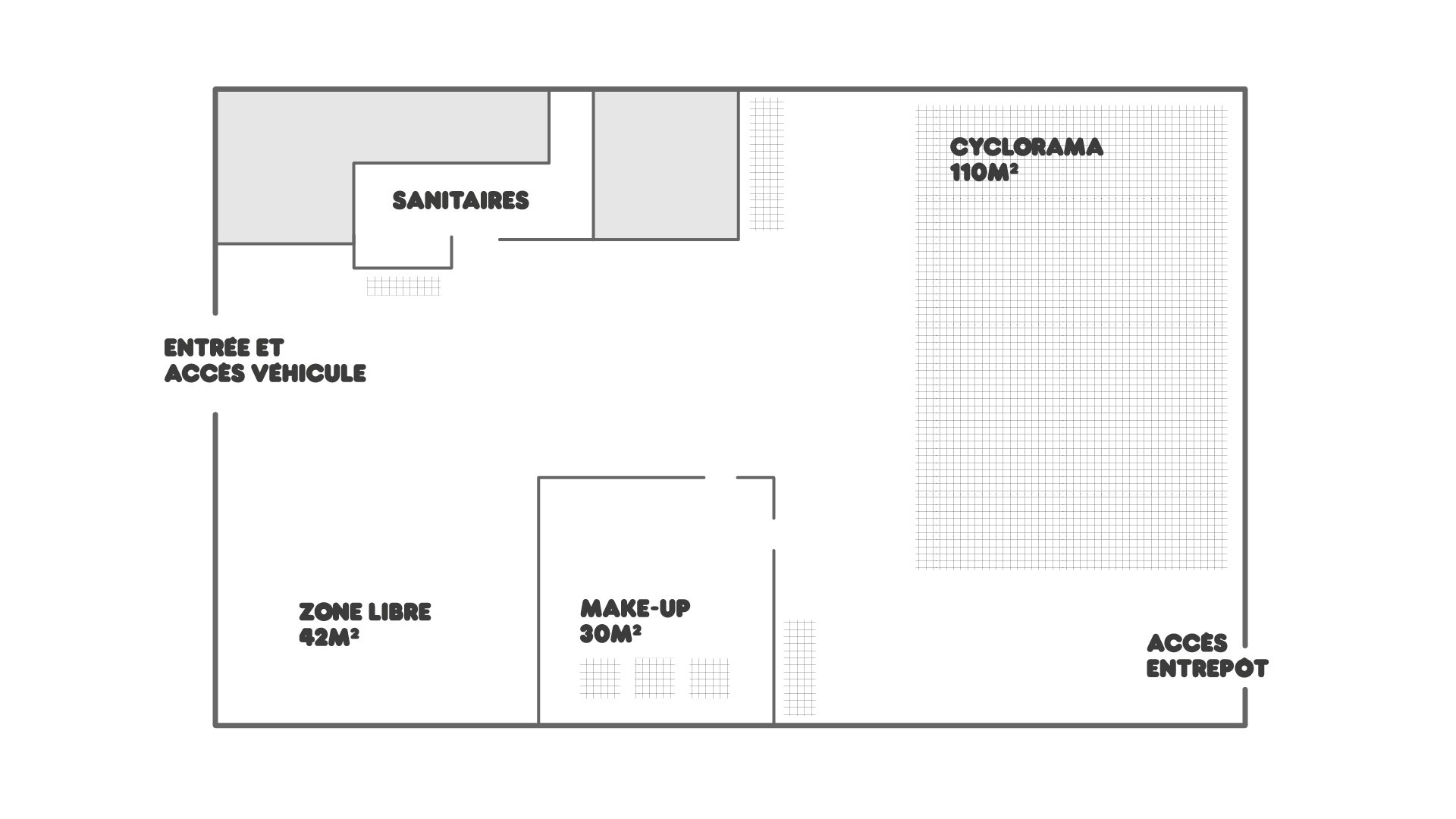 Plateau de 400m² en RDC (8m de hauteur) - Cyclo 2 faces 120m² (5m de hauteur) 20m de recul.
